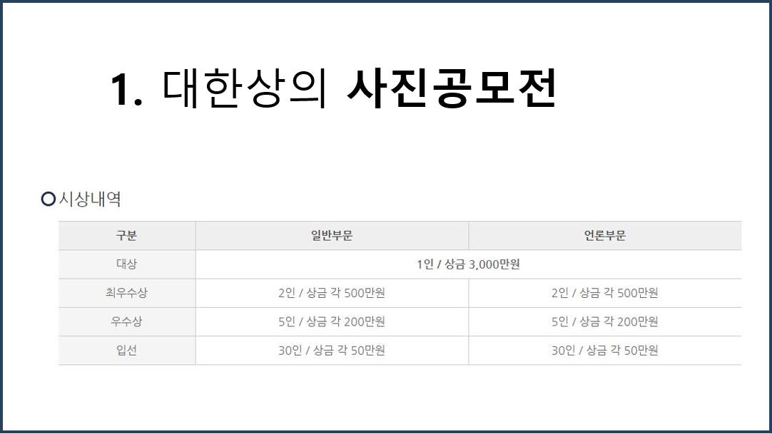 대상이 3천만 원입니다. 여기는 언론사 기자들이 출품을 함께 합니다. 대상 타기 쉽지 않아요. 아는 후배가 2번이나 대상을 타긴 했는데,….. 한국 사진기자들 사진 정말 잘 찍어요. 그리고 일반인들이 갈 수 없는 곳에서 쉽게 연출할 수 있거든요. 그런데 일반인들도 함께 하는 공모전이다 보니 골고루 배분을 합니다. 최우수상도 500만 원입니다. 그전에 수상한 사진들을 보면서 어떤 사진들이 상을 받았는지 보시고 도전해 보시면 좋을 듯합니다.