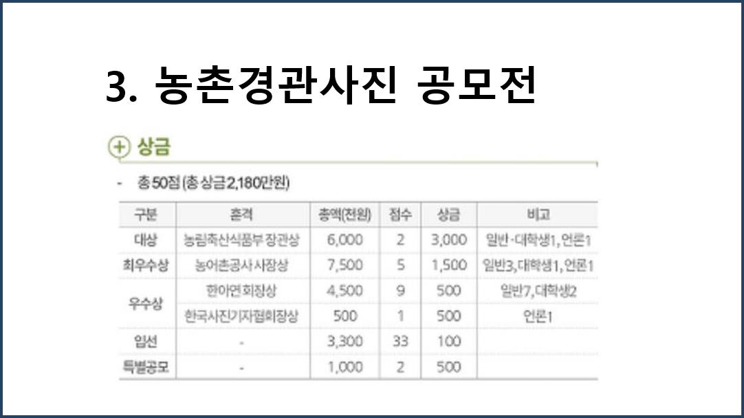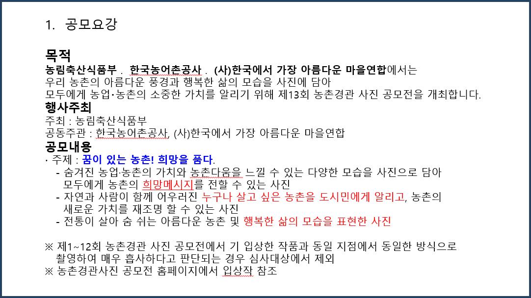 - 숨겨진 농업·농촌의 가치와 농촌다움을 느낄 수 있는 다양한 모습을 사진으로 담아 모두에게 농촌의 희망 메시지를 전할 수 있는 사진