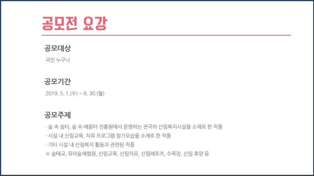 공모주제가 전국의 산림복지시설을 소재로 한 작품들로, 시설 내에서 이루어지는 각종 프로그램, 산림레포츠, 산림치유, 숲 체험 산림 휴양 등이거든요.