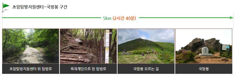 - 초암탐방지원센터에서 초암사, 봉두암을 거쳐 국망봉으로 올라가는 탐방코스