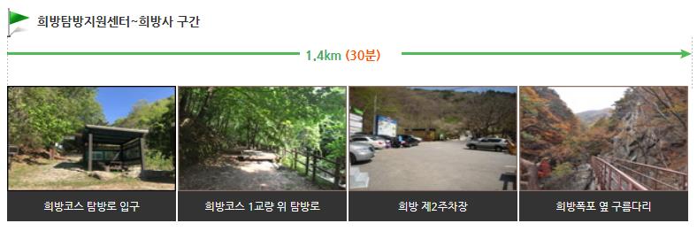 ◎ 희방사코스의 희방탐방지원센터~희방사 구간 탐방코스는 희방계곡자연관찰로를 따라 탐방할 수 있으며, 약 1.4km이며 소요시간은 30분 정도이다.