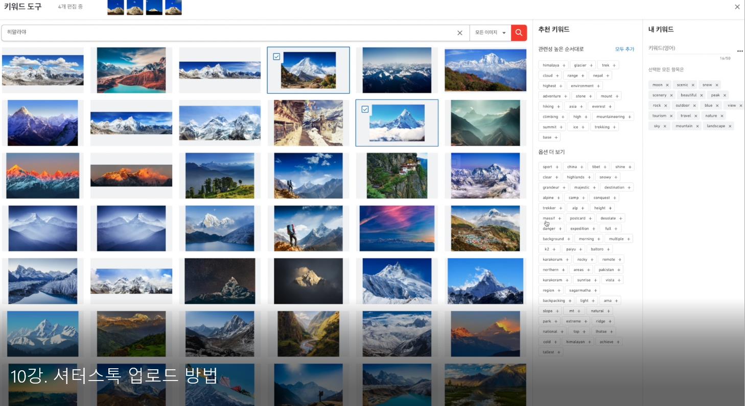 그러면 지금 검색한 키워드로 다른 작가들이 올려놓은 (같은 키워드를 사용한) 사진들이 뜹니다. 여기서 내 이미지와 비슷한 사진 3개를 클릭하시면 공통된 키워드가 뜹니다. 3개 이상을 클릭해야만 공통 키워드가 뜨고요, 4개~5개 이상을 해도 상관없습니다. 여기서 마음에 드는 키워들 선택하시면 됩니다. 키워드 옆에 있는 플러스를 누르면 첨부가 되고 잘못 첨부했으면 오른쪽에 첨부된 키워드를 삭제하면 됩니다. 키워드는 많이 해줄수록 검색에 걸리기 쉽기 때문에 그만큼 노출이 많이 되겠지요? 가장 최적화된 키워드를 넣으시기 바랍니다.