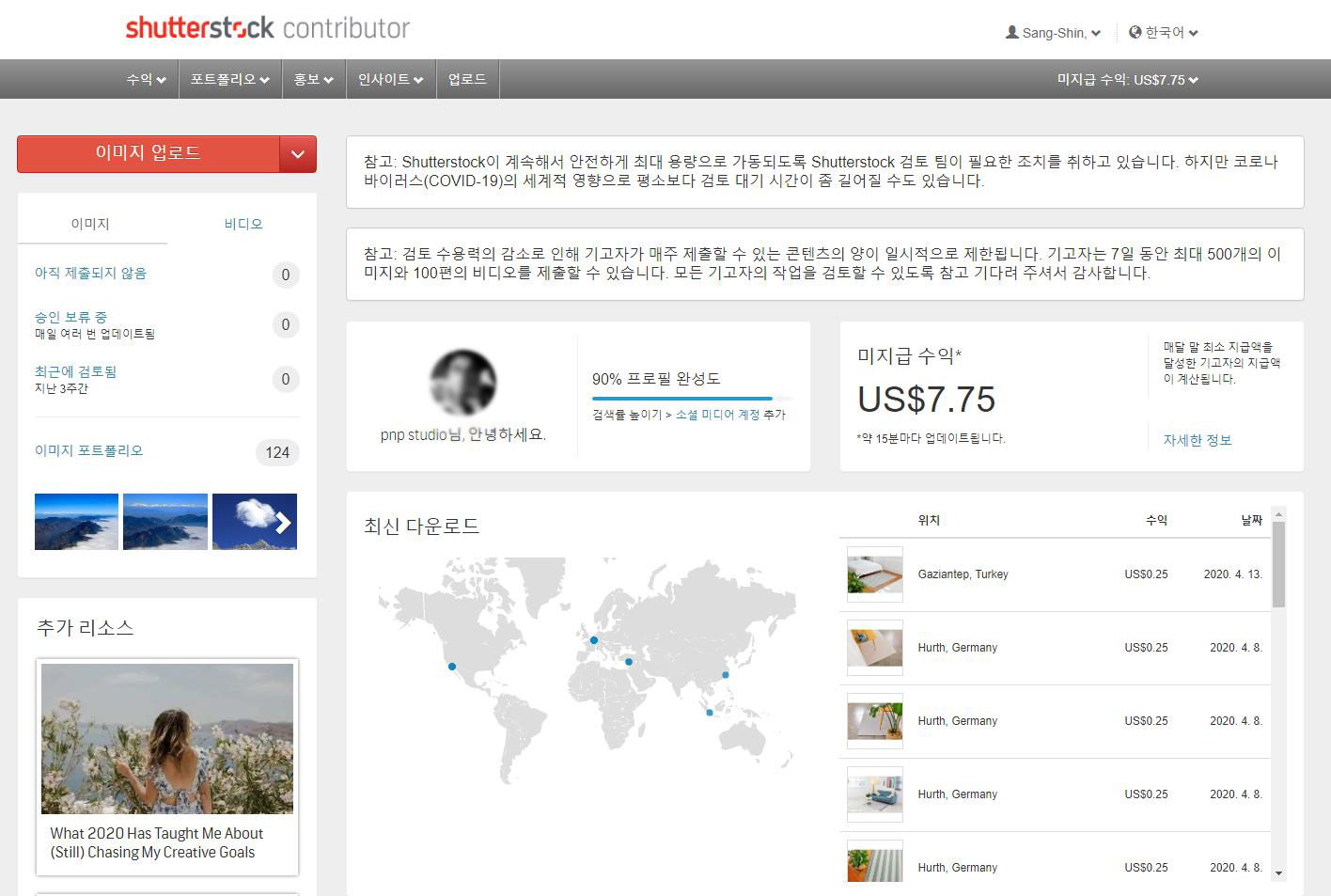 전 이미 등록을 마친 상태고 이미지 몇 장이 올라가 있습니다. 저는 픽스타와 전속계약을 한 작가이다 보니 셔터스톡은 픽스타에 등록 안 된 사진들로 2월 말쯤에 몇 장 올려놓았고, 총 124장 정도 업로드해 놓은 상태입니다. 그 사이 30장 이상 팔렸네요. ^^