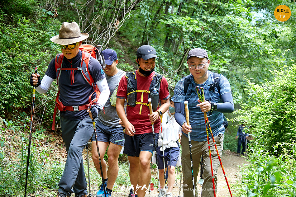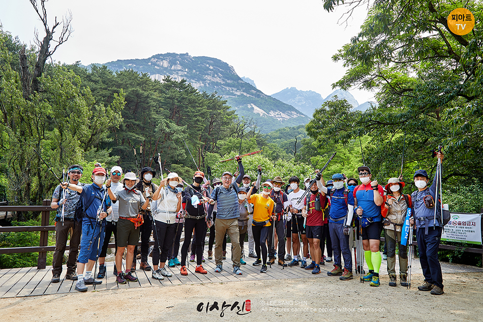 노르딕 워킹팀들의 출발 전 북한산을 배경으로 파이팅을 외치고 있습니다. 날씨는 많이 무더웠지만 에너지 넘치는 많은 분들과 함께 시원한 숲 속 길을 걷는 즐거움은 참 좋았습니다.