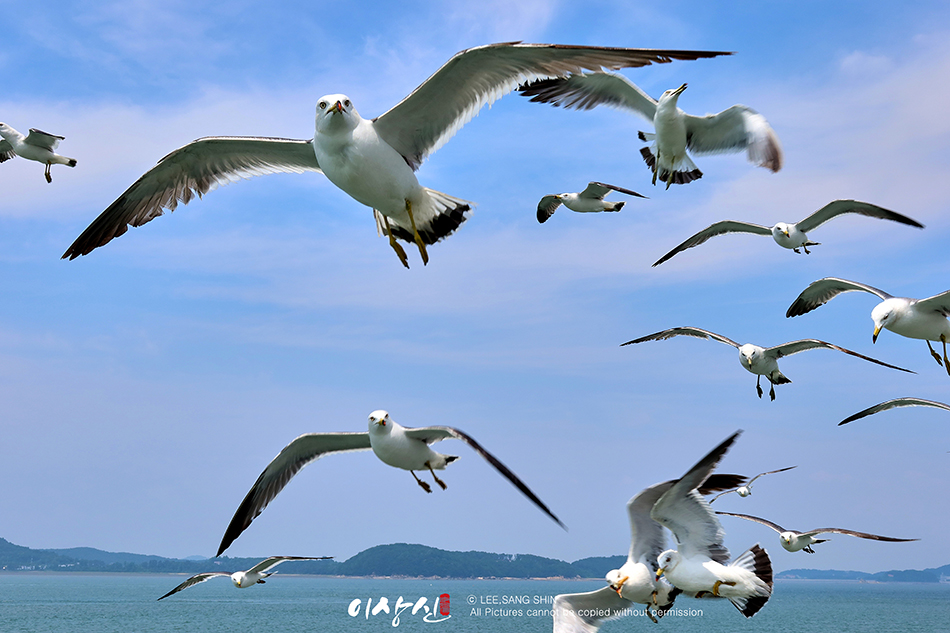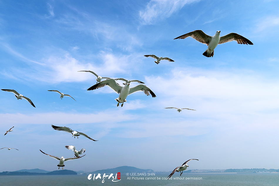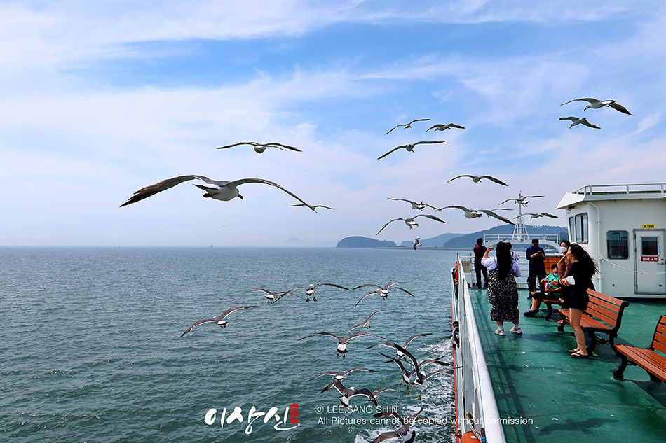 갈매기가 장봉도까지 따라 와요. 배 2층 뒤쪽에 가면 갈매기에게 던져줄 새우깡을 팝니다. 갈매기들이 엄청 많아요.