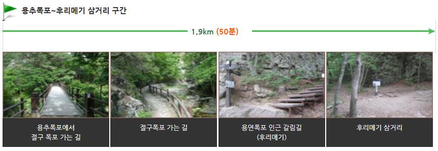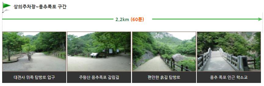 주왕계곡 탐방로의 대전사 ~ 용추폭포 구간은 평탄한 흙길 탐방로로, 약 2.2km 구간에 1시간 정도 소요되는 구간입니다.