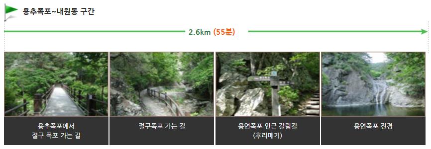용추폭포 ~내원동 구간 등산로는 돌길과 목재데크 교량 등을 따라 올라가게 되며, 약 2.6km 구간에 소요시간은 약 55분 정도 소요됩니다. 유모차, 휠체어 등산은 어려우며, 돌길은 많지만 경사지지는 않아 운동화로도 등산이 가능한 구간입니다.