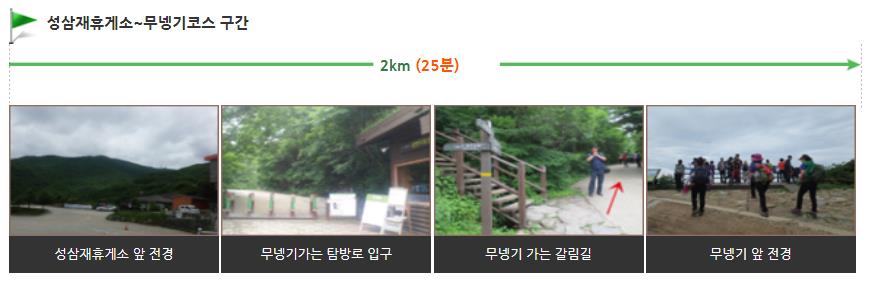 이 구간에는 함박꽃나무, 철쭉, 쪽동백나무, 신갈나무, 거제수나무 등의 고산지 식생의 사계절 변화상과 산새들의 지저귐을 함께하면서 산행의 묘미를 잘 살릴 수 있는 구간입니다.