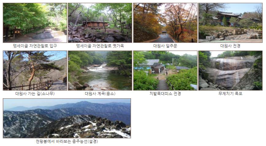◈ 지리산 대원사(유평) 코스 : 유평탐방지원센터 → 유평청소년수련원(밤밭골) → 치밭목 대피소 → 천왕봉 → 로타리 대피소 → 중산리 탐방안내소