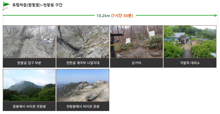 코스는 유평탐방지원센터 → 유평청소년수련원(밤밭골) → 치밭목 대피소 → 천왕봉 → 로타리대피소 → 중산리 탐방안내소로 이어지는 긴 구간으로 총거리는 21.5km, 소요 시간은 12시간 30분으로 1박 2일 일정으로 진행을 하시고 산행 난이도는 '상'입니다.