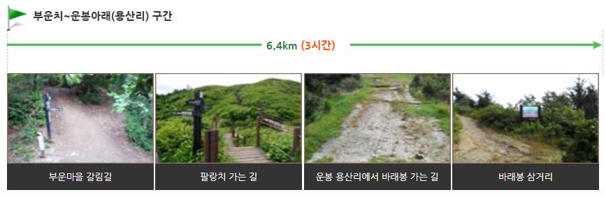 부운치 ~ 바래봉 ~ 운봉 용산리 구간은 경사가 완만한 흙길 탐방로와 인공블록으로 조성된 경사구간이 있으며, 약 6.4km 구간에 3시간 정도 소요됩니다.