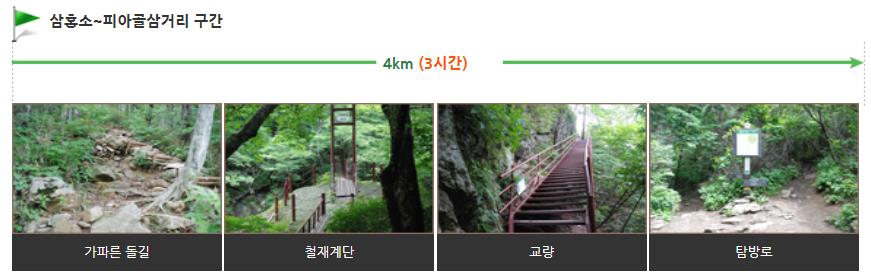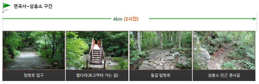 계곡을 따라 잘 조성된 탐방로는 흙길과 돌길로 평탄하게 되어 있어 가족 단위의 산행도 좋습니다. 삼홍소까지는 시원한 물소리와 붉은 단풍을 볼 수 있는 시기인 여름, 가을 탐방을 추천합니다.