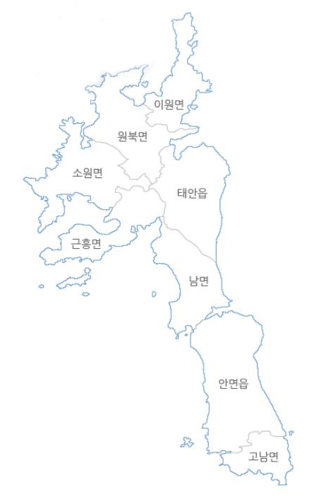 태안군은 동쪽을 제외하고는 3면이 모두 바다로 둘러싸인 반도로써 국내 유일한 해안국립공원이 위치하고 있는 지역으로 해안선의 길이가 559.3km이며 안면도 천연송림과 곳곳마다 절경을 가진 32개의 해수욕장이 있으며, 114개의 크고 작은 섬들이 분포되어 있는 곳입니다.