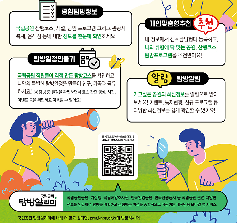 국립공원 탐방알리미는 앱스토어와 플레이스토어에서 ‘국립공원 탐방알리미’로 검색해 설치하면 된다.