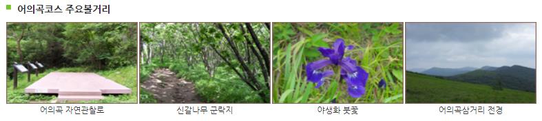 어의곡에서 어의곡삼거리 구간 탐방로는 충북지역에서 소백산국립공원의 주봉인 비로봉을 최단시간에 탐방할 수 있는 코스로 5.1㎞ 구간에 약 2시간 40분(편도) 소요된다.